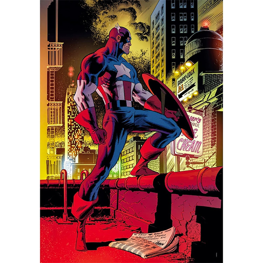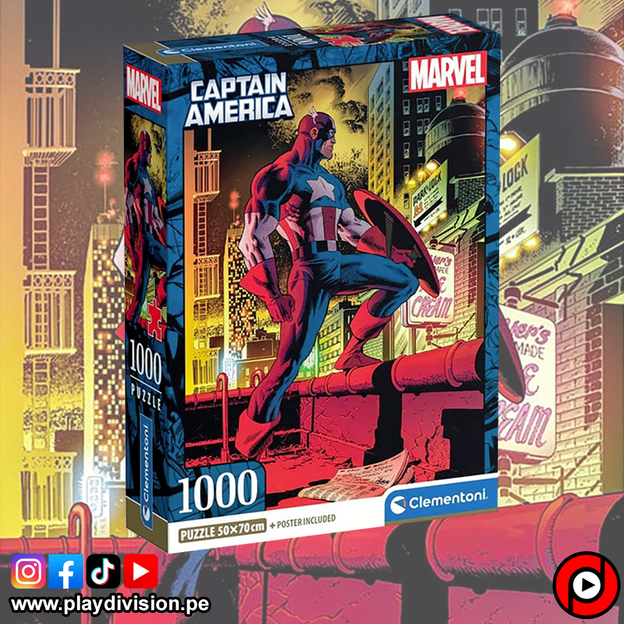 Rompecabezas de la marca Clementoni de 1000 piezas con imagen del superhéroe de Marvel americano por excelencia, el Capitán América sobre la terraza de un edificio de la ciudad.