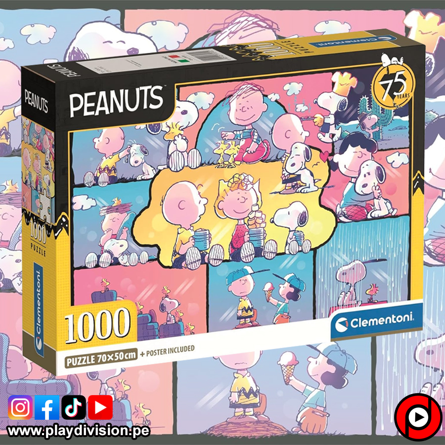 Rompecabezas de la marca Clementoni de 1000 piezas con imagen de un collage en colores suaves de los personajes de las viñetas de Snoopy.